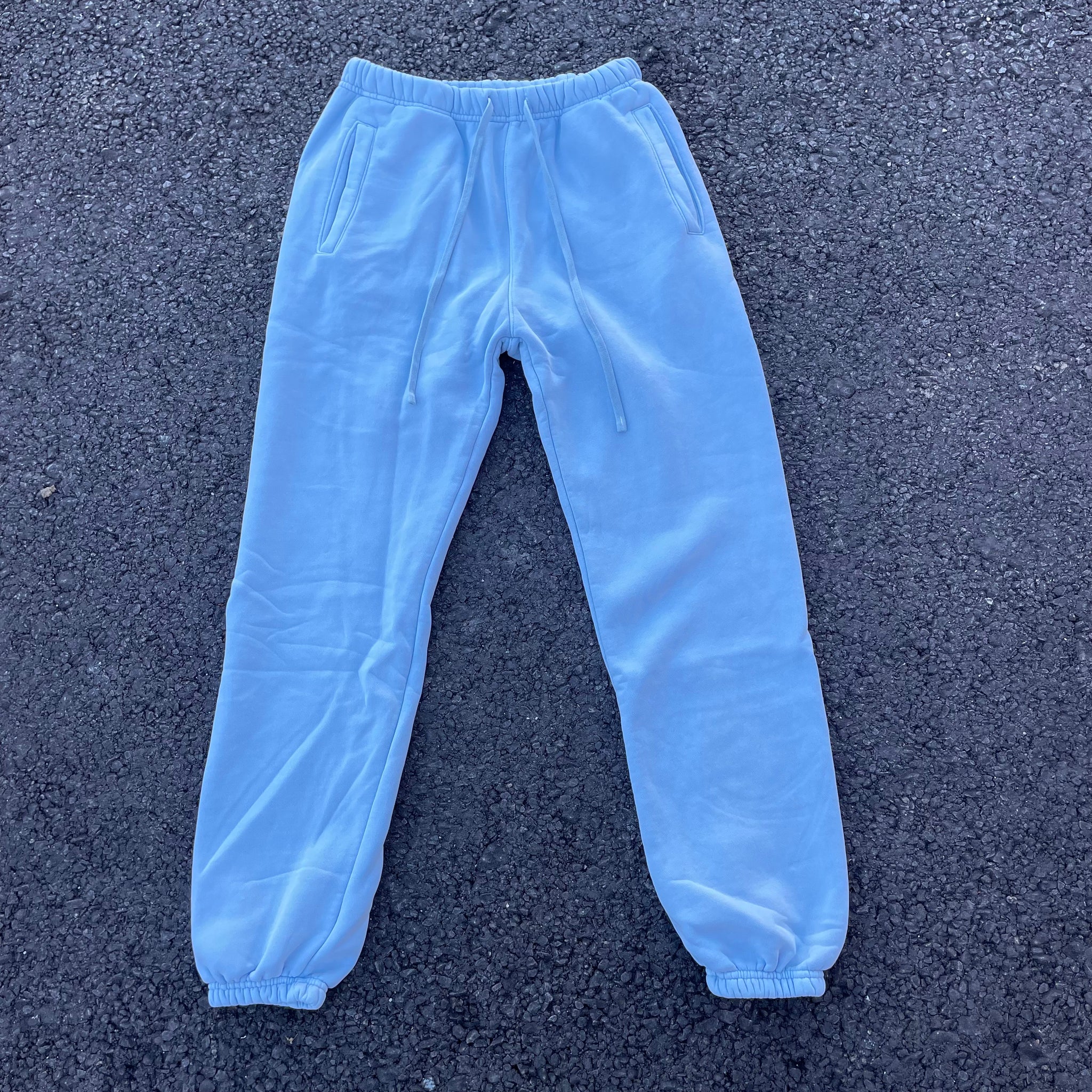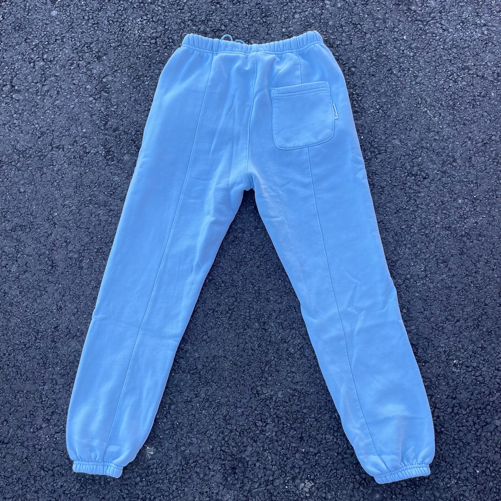 Our blue dream sweatpants are designed with a cozy fleece lining, three handy pockets, and a small "let them know" tag. The ruched ankles and adjustable waistband offer a customizable fit. This simple design allows for versatility in your wardrobe.