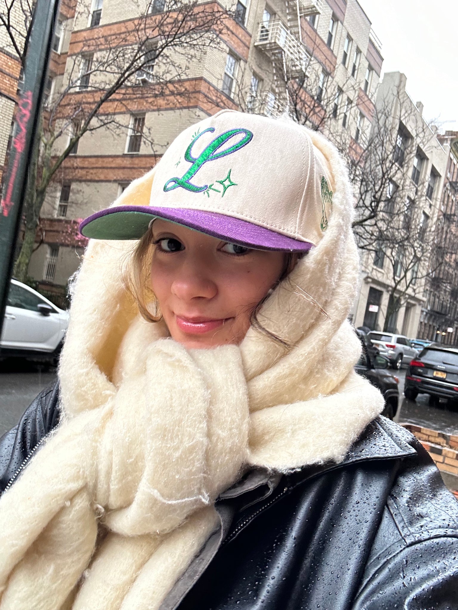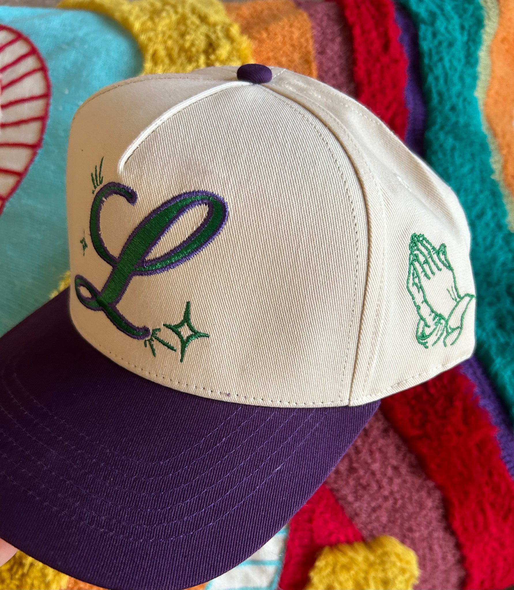 With eye-catching purple and green embroidery, this cream-colored cotton hat is sure to turn heads. The purple bendable brim with a green underside adds a pop of color and personality. Whether you're out running errands or hanging out with friends, this unique hat is a subtle yet stylish way to express your faith and style.